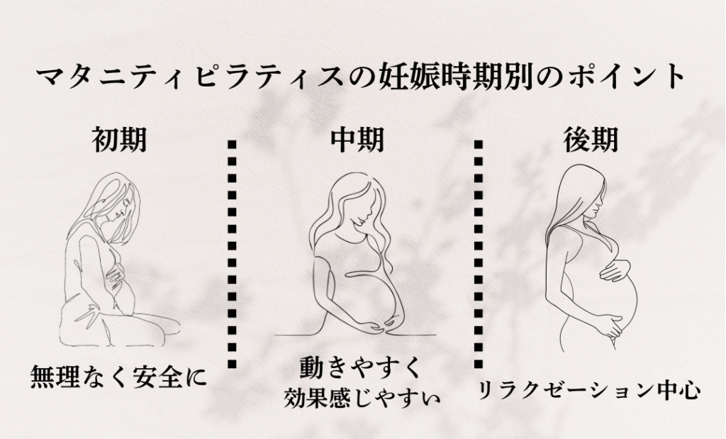 ここでは、妊娠時期別にマタニティピラティスを行う際のポイントについてご紹介します。