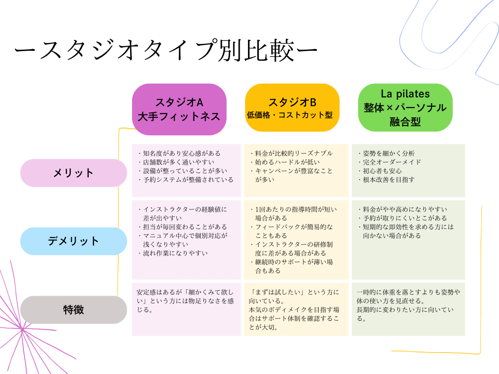 タイプ別比較|マンツーマンピラティススタジオの違い